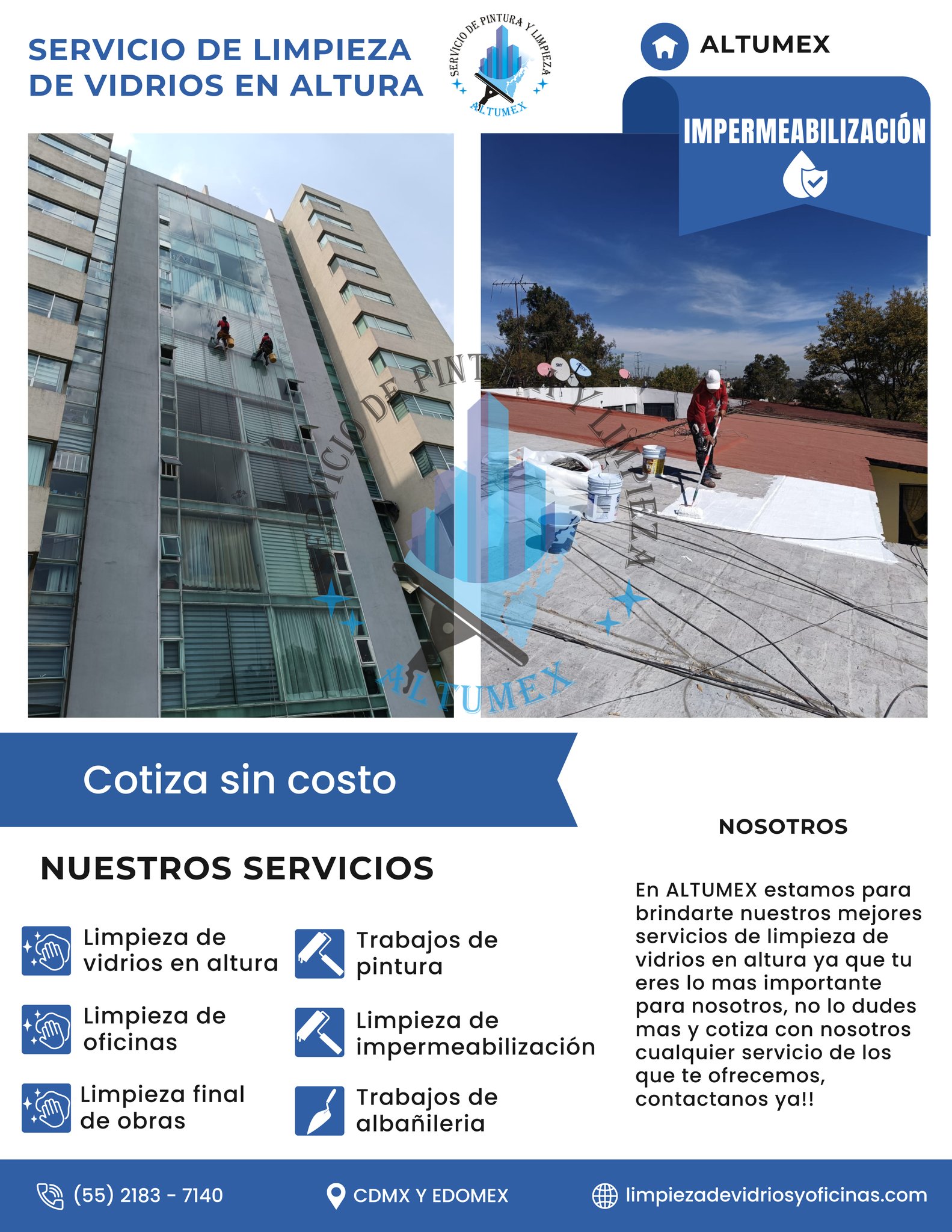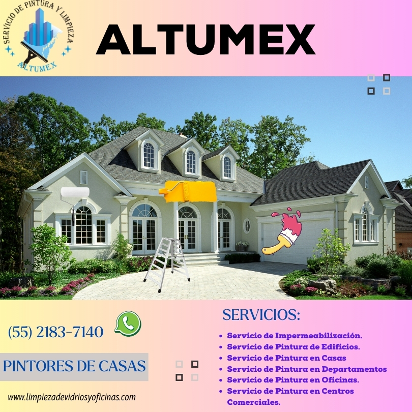 ALTUMEX es una empresa que ofrece servicios de pintura de casas, limpieza de vidrios en altura, servicio de impermeabilización cdmx y Estado de México, con una gran trayectoria en estos servicios y con el objetivo de llevar a cabo un servicio profesional en cada casa, departamento, oficinas, centro comercial a nivel de piso o en altura, ALTUMEX esta comprometido con la calidad y la honestidad en cada servicio de pintura contando con lo mejores pintores de casas, nuestros clientes nos respaldan, si requieres un servicio de pintura no lo dudes mas y llámanos o escríbenos por nuestro WhatsApp nuestro servicio de pintura de casas tiene cobertura en la CDMX y Estado de México estamos listos para iniciar tu proyecto de pintura.