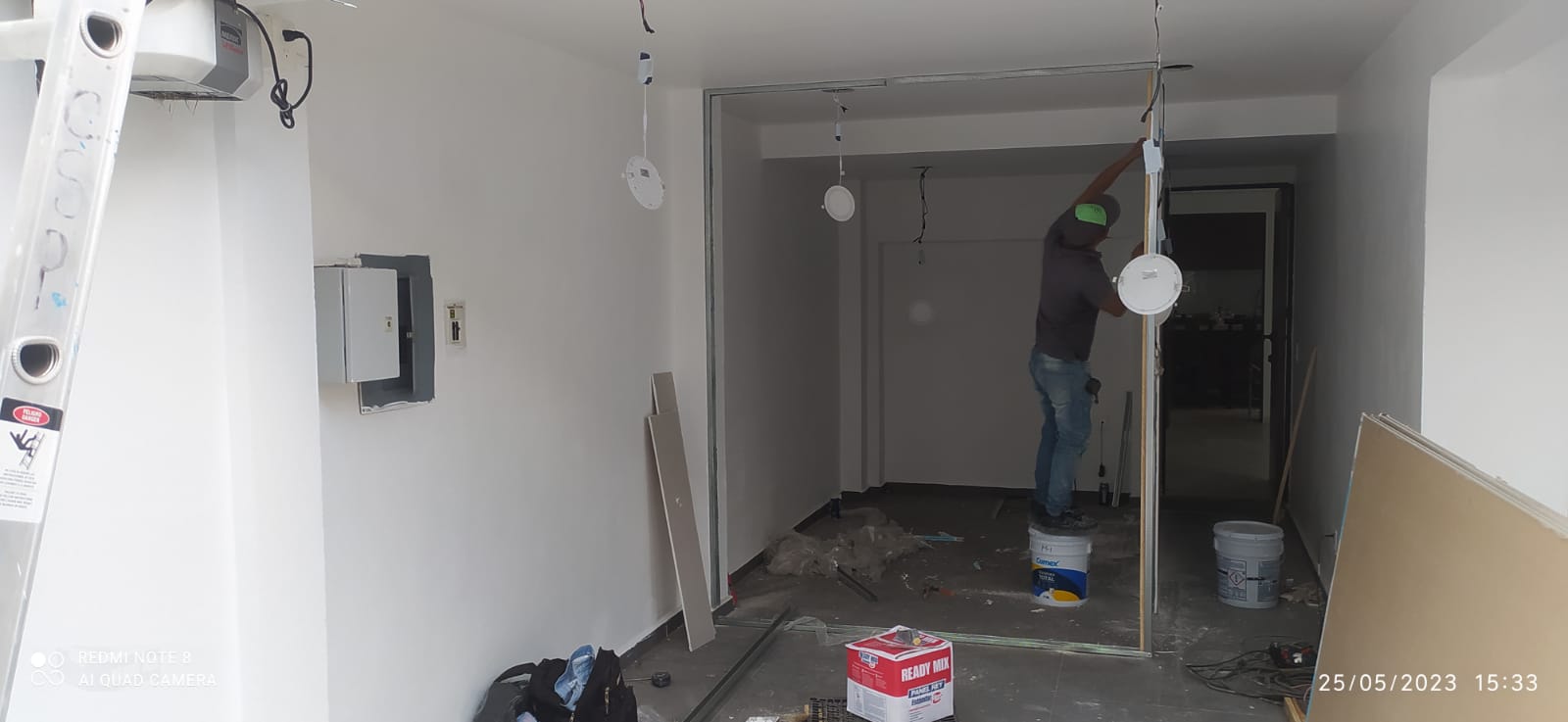 Una vez que el sellador ha hecho su trabajo, se continúa con un primario universal, especialmente útil en zonas con materiales combinados, este primario no solo unifica la absorción, sino que también corrige diferencias de textura que se generan cuando los muros han sido parchados en repetidas ocasiones, en oficinas grandes es común encontrar muros que han sido intervenidos muchas veces por instalación de pantallas, cableado, soportes o remodelaciones ligeras, dejando pequeñas huellas que solo se revelan cuando la luz pega lateralmente, el primario universal cubre estas irregularidades y genera una base sólida sobre la cual la pintura se distribuye de forma pareja, logrando un color más uniforme desde la primera capa.