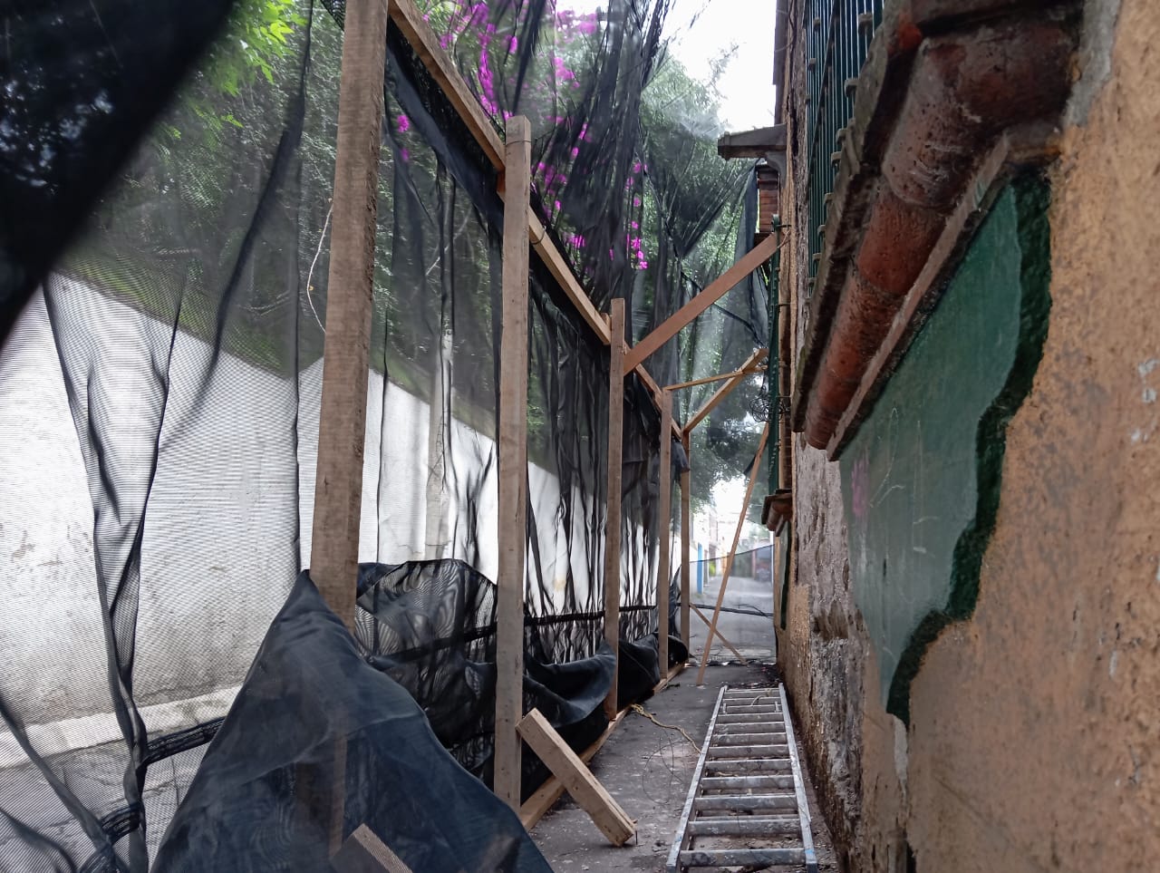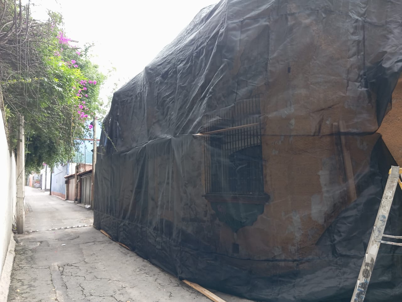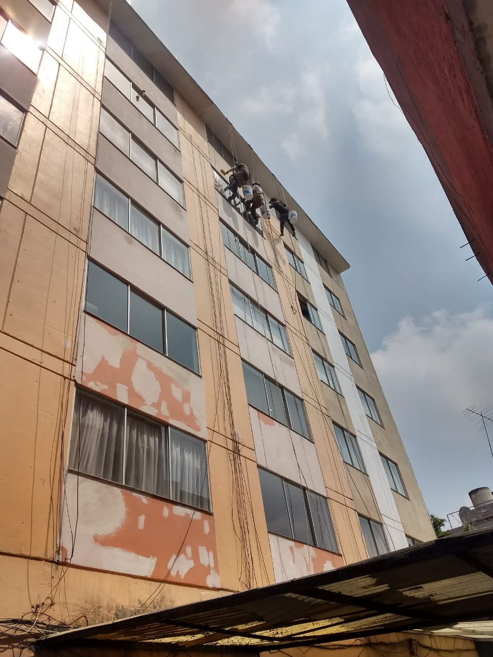 ALTUMEX además de ser una empresa de pintura en alturas también cuanta con el equipo necesario para realizar trabajos de restauración total de fachadas en la cdmx y Edomex contamos con pintores de casas cdmx calificados para realizar este tipo de servicio de pintura y mantenimiento, en hora buena iniciamos un trabajo de mantenimiento de una fachada que está deteriorada por la falta de mantenimiento sin embargo no es una fachada común es una fachada que tiene más de 50 años de antigüedad y por lo tanto está construida de adobe y cal con herrería artesanal la cual nuestra clienta nos contactó para darle mantenimiento y un servicio de pintura profesional, es importante comentar que no todas las empresas de pintura pueden hacer este tipo de servicios de mantenimiento ya que para trabajar el adobe lleva un proceso delicado y profesional pero aún más cuando se trata de restaurar todo lo que está en mal estado ya que se debe de construir un apartado de protección para llevar a cabo el servicio de mantenimiento y pintura antes de iniciar con el trabajo, como se puede apreciar en la imagen es una fachada con mas de 15 metros cuadrados y una pared esta más maltratada que otra.