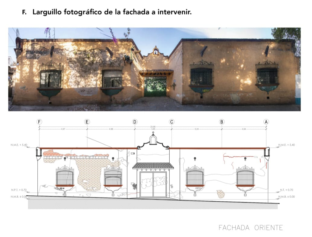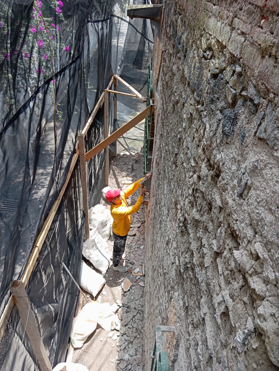 Seguimos con la integración de argamasa cal-arena prop. 1:2 pigmentado acabado floteado para el proceso de pintado donde previamente a la realización de los trabajos se deberá proteger con película de polietileno y cinta canela las áreas aledañas y realizar protección para evitar la caída de material. Una vez que la superficie está limpia y preparada, la superficie deberá ser humectada a saturación antes de aplicar la argamasa cal-arena prop. 1:2 con pigmento y el color aprobado; el acabado será bruñido con llana metálica cuya textura deberá igualarse a los vestigios. Se deberá hacer una limpieza final para retirar residuos de mezcla de las áreas aledañas.